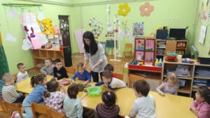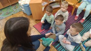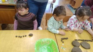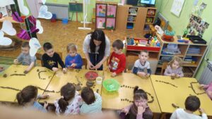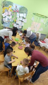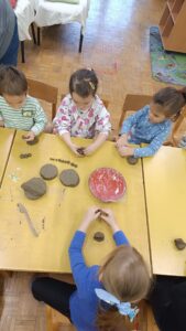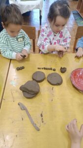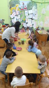 Наставница ликовног васпитања и сликарка, Биљана Влатковић, посетила је млађу васпитну групу васпитача Милице Обрадовић и Диане Селар, где је реализовала посебну ликовну радионицу. Деца су први пут имала прилику да се упознају са глином и да је обликују сопственим рукама. Кроз игру, а развијајући и откривајући креативност, деца су стварала различите облике и фигуре. Радионици су се придружила и деца из других васпитних група, која су заједно са млађим другарима направила чиније и украсне тањире. Атмосфера је била весела и инспиративна, а деца су са одушевљењем обликовала своје прве уметничке радове од глине, истражујући материјал и развијајући своје креативне способности.