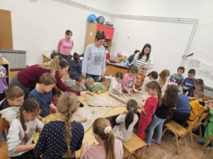 У оквиру пројекта “Ваљамо, ваљамо, уметност стварамо” група васпитачица Милице Малбаша и Бојане Михл посетила је наша сликарка и вајарка Биљана Влатковић која је децу увела у чаробни свет ликовног стваралаштва.
