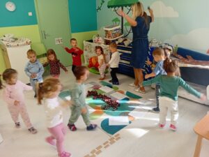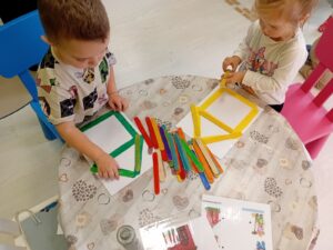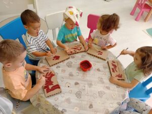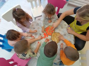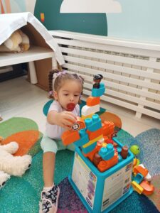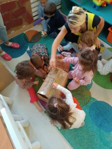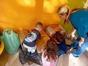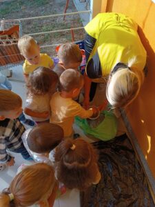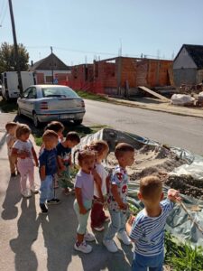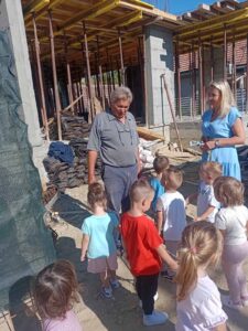 Деца јаслене групе “Лоптице” су кроз различите активности у пројекту “Градим, градим кућицу” уживала истражујући и упознавајући се са различитим врстама грађевинског материјала. Током претходних сунчаних дана, посетили су оближње градилиште па напослетку и сами зидали кућицу од цигле, а потом и од различитог материјала (слама, даске). Такође, посетили су продавницу “Шраф” где су додатно упознали различите материјале и алате који се користе у изградњи.