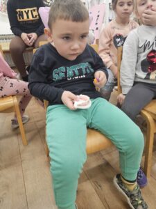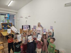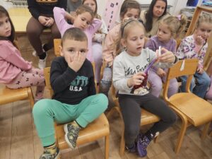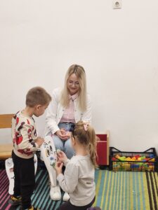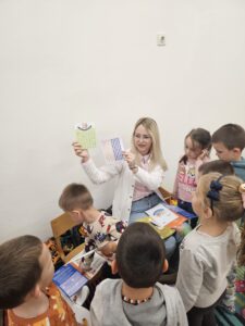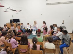 На веома приступачан и забаван начин, докторка је деци објаснила како исхрана утиче на здравље зуба, која храна им помаже да буду јаки и здрави, а шта би требало избегавати. Деца су активно учествовала, постављала питања,интересовала су се за инструменте, посматрала их ….