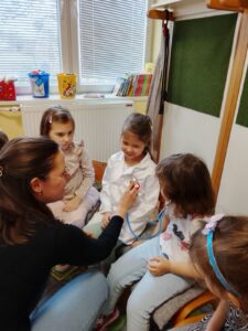 У оквиру пројекта “Вртић суперхероја”, деца васпитача Илоне Јанович и Рите Живу остварила су сарадњу са породицом и локалном заједницом. У оквиру сарадње са породицом децу у вртићу су посетиле медицинска сестра и фармацету – маме деце из групе. Маме су са децом разговарале о важности очувања здравља, здравим животним стиловима, функционисању човековог тела..