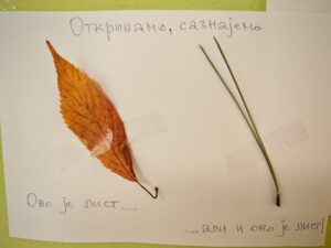 У оквиру пројекта “Дрво-лист”, деца узраста 3 до 5 година, васпитача Смиље Мирић и Милане Шашић, истраживла су свет дрвећа, лишћа и природних процеса који их окружују. Кроз разноврсне активности деца су посматрала, упоређивала, манипулисала природним материјалима и градила своје закључке о томе како дреће расте, какви све листови могу бити, чему служе, чему служе и због чега су важни за животно окружење.