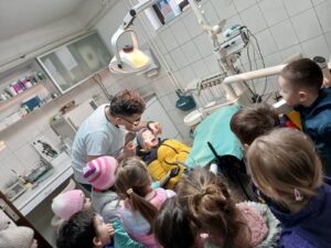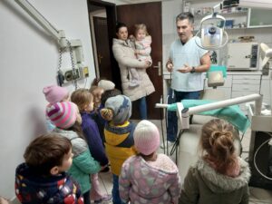Током посете, деца су са великим интересовањем посматрала рад стоматолога, упознала се са основним инструментима и начином прегледа зуба. На њима прилагођен и занимљив начин објашњено им је зашто је важно редовно прање зуба, правилна исхрана и одлазак код зубара. Захваљујемо се др. Борису Тарноцком на труду и посвећености.